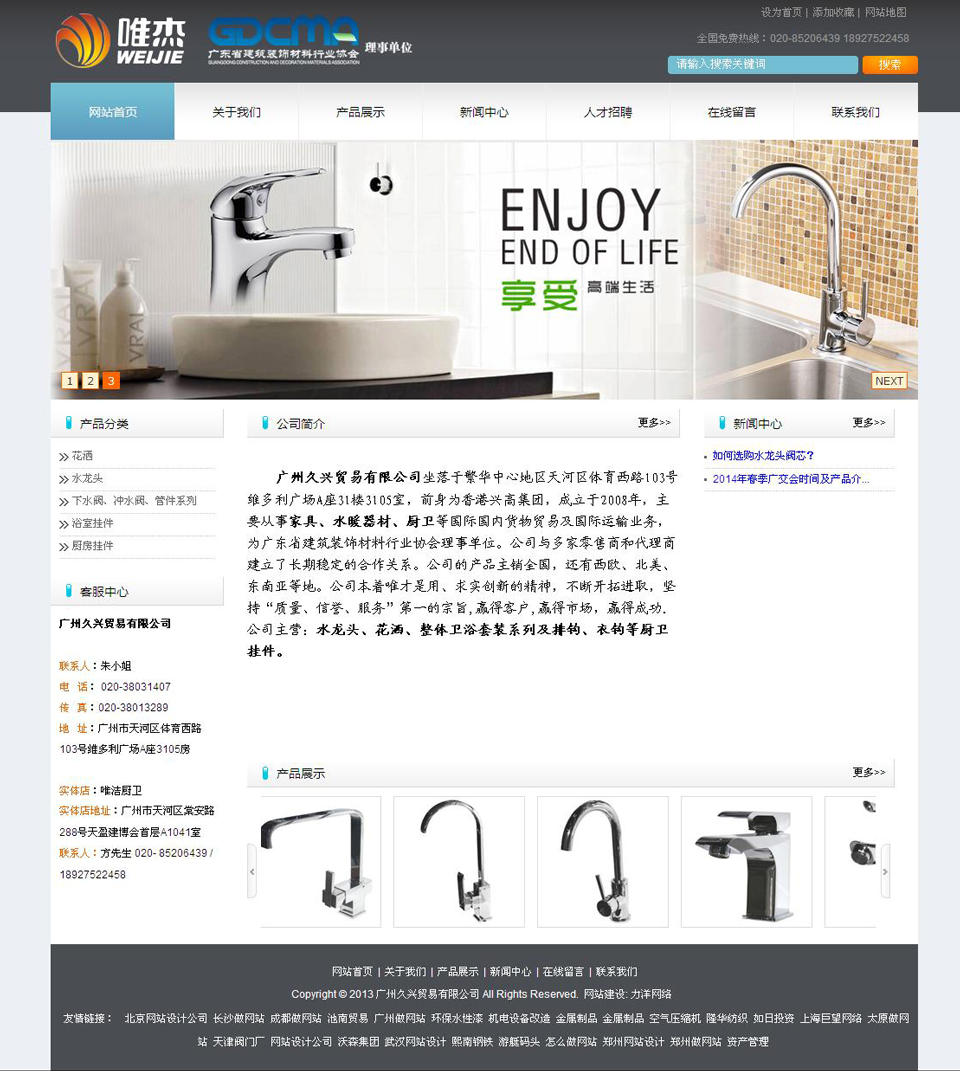 广州久兴贸易有限公司坐落于繁华中心地区天河区体育西路103号维多利广场A座31楼3105室,前身为香港兴高集团,成立于2008年,主要从事家具、水暖器材、厨卫等国际国内货物贸易及国际运输业务,为广东省建筑装饰材料行业协会理事单位。公司与多家零售商和代理商建立了长期稳定的合作关系。公司的产品主销全国,还有西欧、北美、东南亚等地。公司本着唯才是用、求实创新的精神,不断开拓进取,坚持“质量、信誉、服务”第一的宗旨,赢得客户,赢得市场,赢得成功. 公司主营:水龙头、花洒、整体卫浴套装系列及排钩、衣钩等厨卫挂件。