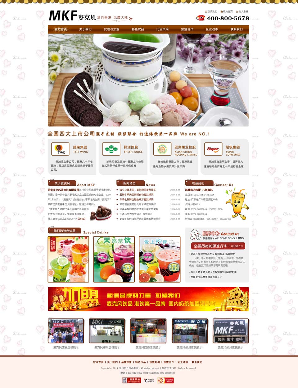 项目名称:郑州麦克风茶饮料有限公司 签定时间:2014-3-26 项目网址:http://www.mkfdrink.net 项目简介: 2009年3月31日,香港麦克风实业(集团)有限公司成功的进驻了中国大陆地区。在大陆
