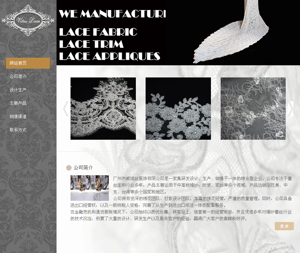 广州市威塔丝服饰有限公司是一家集研发设计、生产、销售于一体的综合型企业。公司专注于蕾丝面料行业多年,产品主要运用于中高档婚纱、时装、家纺等多个领域,产品远销至欧美、中东、台湾等多个国家和地区。