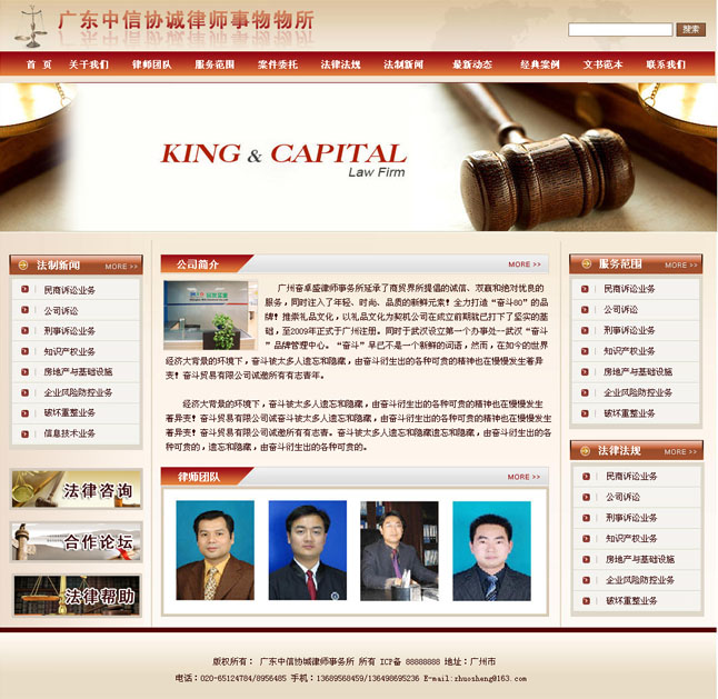 项目名称:广东中信协诚律师事务所网站建设签定日期:2009年10月26日中信律师长期以来专业从事企事业单位改制、转制、重组、并购、证券发行及上市等资本运作领域的法律服务工作,积累了丰富的实践经验,并取得了明显的成绩;多年来,中信律师曾代表发