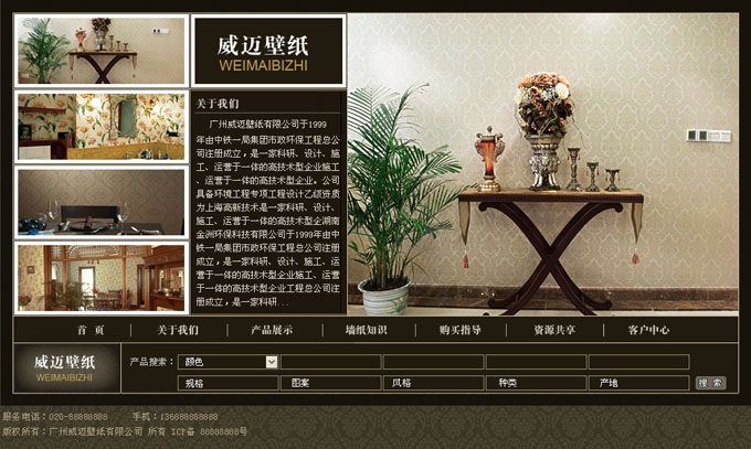 网站主要栏目: 首页、关于我们、产品展示、墙纸知识、购买指导、资源共享、客服中心、产品搜索