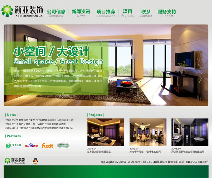 项目名称:广州薪亚建筑装饰工程有限公司网站制作签定日期:2009年12月11日广州市薪亚装饰设计工程有限公司,成立于2005年,是广东省装饰协会会员单位及工会组织成员,具备合法经营资格的集设计、施工、工程监督、配套为一体的专业公司。薪亚装饰
