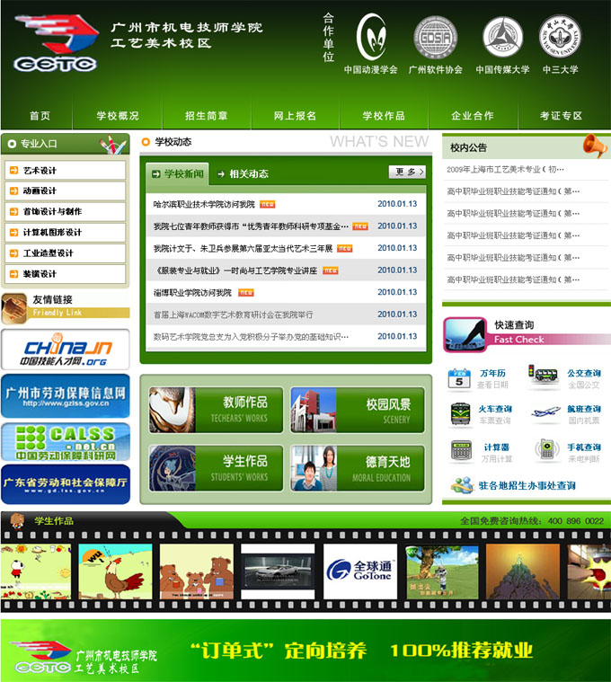 项目名称:广州机电技师学院工艺美术校区网站建设签定日期:2010年3月9日网站首页效果: