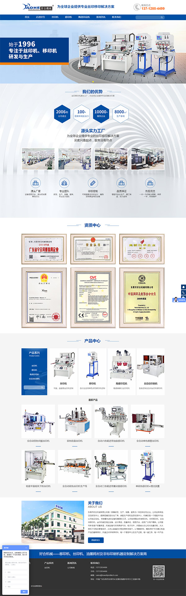 东莞市好合机械有限公司是一家集研发、生产、销售、服务为一体的综合性企业。公司设有有独立的研发中心、颇具规模的现代化厂房、装配生产线和品质检测中心,机器的每一个零配件均由公司独立完成。 凭借着先进的设备和精湛的工艺,公司陆续推出标准移印机、非标移印机、全自动移印机、丝印机械及周边设备,设计美观、质量保证、规格齐全,倍受广大用户青睐。公司面向新老客户郑重承诺,机械设备均采用原装气动、电子元件,并直接从总公司大批量采购,大大降低了采购及管理成本,从而以超值的价格回馈新老客户。以"精确结构、精良用材"作为精工制造产品的最高原则,并通过对所有原材料、每一个零部件以及生产过程,每一道工序、每一件产品的严格把关来保证产品质量要求以及配套能力,使我们合作的每一个客户真正得到"省心、省事、省钱。" 公司一贯遵循"质量第一、顾客至上"的宗旨,以"诚""信"为行业准则,为用户提供优质的产品、优良的服务.