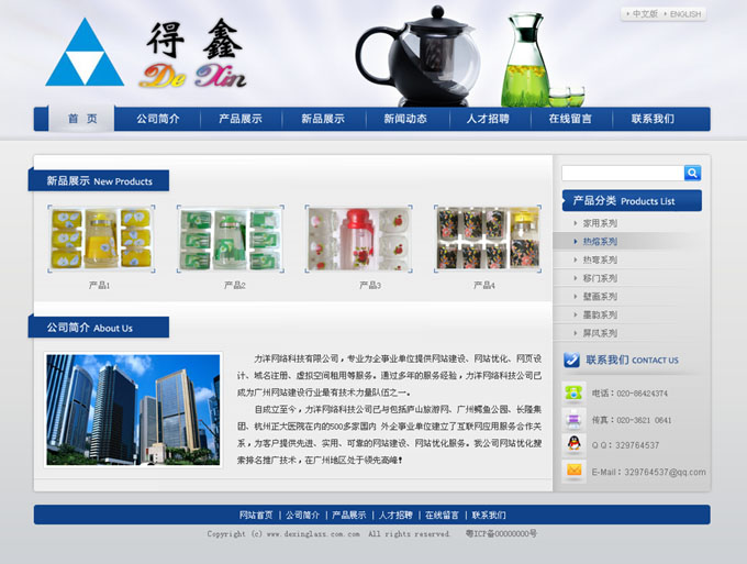 项目名称:得鑫玻璃加工厂网站建设签定日期:2010年12月17日广州市白云区得鑫玻璃加工厂是一家专业生产及供应日用玻璃器皿的工贸型企业,创建于1999年,总厂位于广州市白云区,分厂位于湖北省孝感市。厂房、仓库建筑面积达10000平方米,拥有