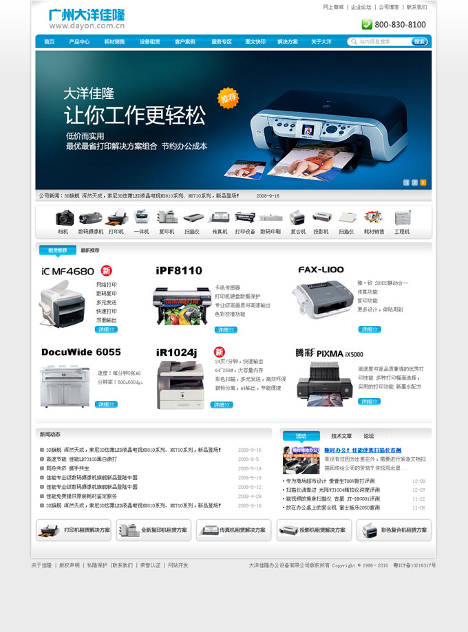 项目名称:广州大洋佳隆有限公司网站改版签定日期:2010-12-18广州大洋佳隆办公设备有限公司是一家办公设备销售、维修、租赁的专业机构,是日本佳能公司在华南地区最大的综合型佳能经销商,是佳能公司认定的佳能广州地区分销商、佳能五星级维修站、