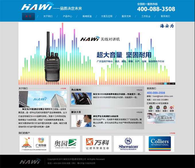 项目名称:广州海安为通信技术有限公司网站建设签定日期:2011年12月3日网址:http://www.hawi-china.com/海安为(中国)通信有限公司拥有专工经验,业务发展迅速,是一家专业无线对讲通信产品生商销售商。全力打造自有海安