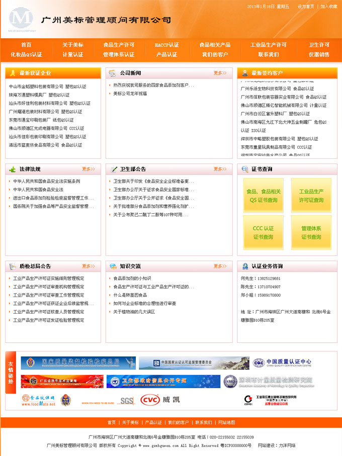 项目名称:广州美标管理顾问有限公司网站建设签定日期:2012年2月22日网址:http://www.gzmbguwen.com广州美标管理顾问有限公司成立于1999年,是一家专业从事食品及食品相关产品QS认证、工业产品生产许可证、ISO质量