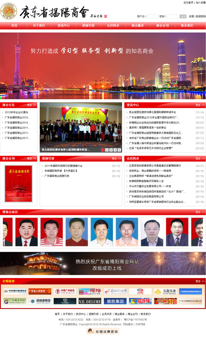 项目名称:广东省揭阳商会网站建设签定日期:2012年4月26日网址:http://www.jycc.org/广东省揭阳商会在省委省政府、揭阳市委市政府等有关部门的关心和支持下,由热衷于公益事业、支持家乡建设的揭籍各界精英自愿组成,商会由陈海