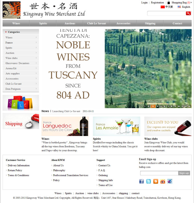 项目名称:世本名酒有限公司网站建设签定日期:2012年4月26日网址:http://www.kingswaywines.comWorldthiswine,"TheWorld"wordfromtheQinDynastyhi
