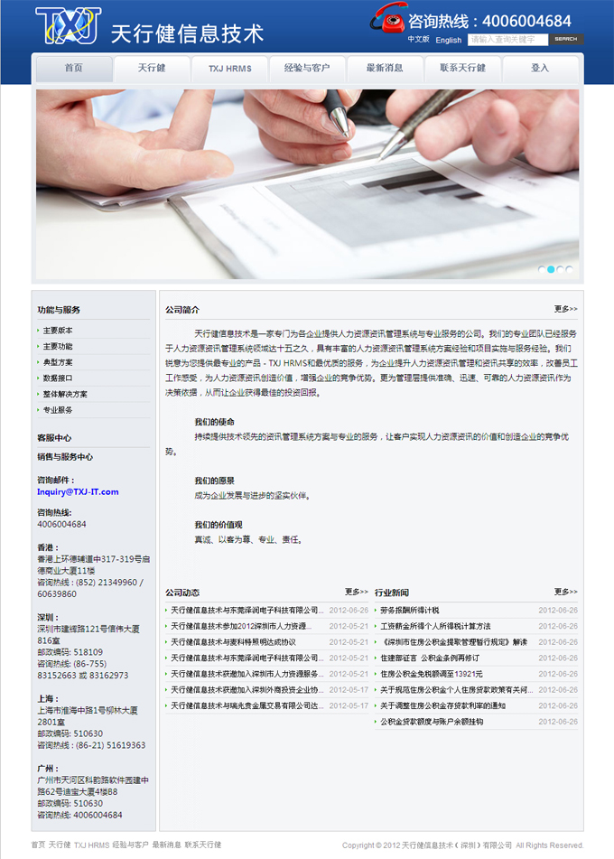 项目名称:天行健信息技术网站建设签定日期:2012年5月10日网址:http://www.txj-it.com天行健信息技术是一家专门为各企业提供人力资源资讯管理系統与专业服务的公司。我们的专业团队已经服务于人力资源资讯管理系統领域达十五之