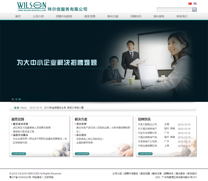 项目名称:广州威文信商务咨询有限公司网站建设签定日期:2012年6月30日网址:http://wilson-services.com玮尔信咨询(WILSONSERVICES)的前身是香港卫尔信招聘服务公司,92年成立。在2008年正式进入中