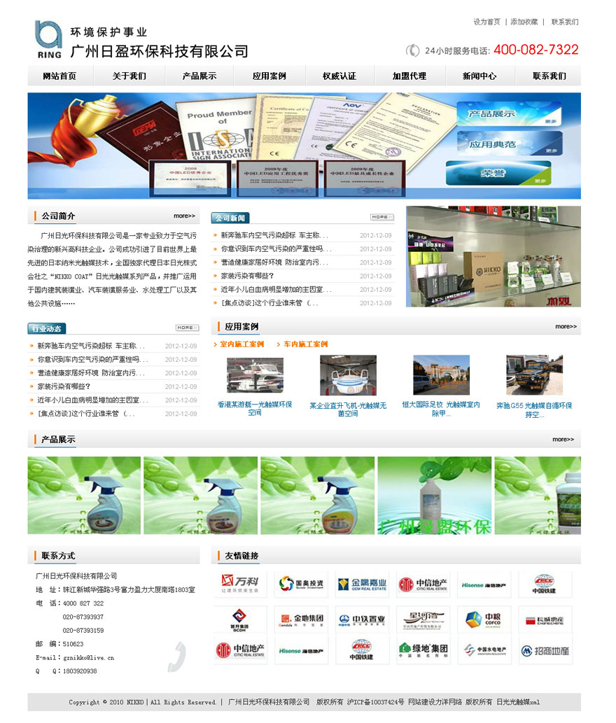 项目名称:日光环保科技签定日期:2012年12月8日网址:http://www.gznikkocoat.com/广州日盈环保科技有限公司是一家专业致力于空气污染治理的新兴高科技企业。公司成功引进了目前世界上最先进的日本纳米光触媒技术,全国独