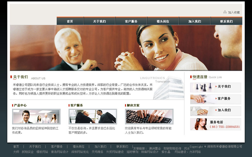 项目名称:禾睿德网站建设签定日期:2012年12月18日网址:http://www.hredy.com/禾睿德公司团队均来自行业资深人士,拥有专业的人力资源素养,深厚的行业背景,广泛的合作伙伴关系。禾睿德立志于成为一家主要从事中高级人才招聘
