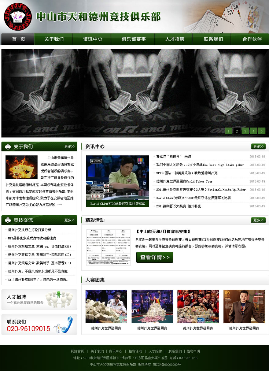项目名称:中山市天和德洲竞技俱乐部网站建设签定日期:2013年3月13日网址:http://www.thpokerclub.com中山市天和德州扑克俱乐部成立于2013年2月,作为中山市首家具备规模的德州扑克智力竞技运动机构,本俱乐部致力于