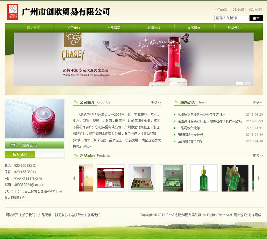 项目名称:广州创欧贸易有限公司网站建设签定日期:2013年3月21日网址:http://www.chaseye.com创欧贸易有限公司成立于2007年,是一家集研究、开发、生产、OEM、贸易、教育、销售于一体的集团化企业,集团下属公司有广州