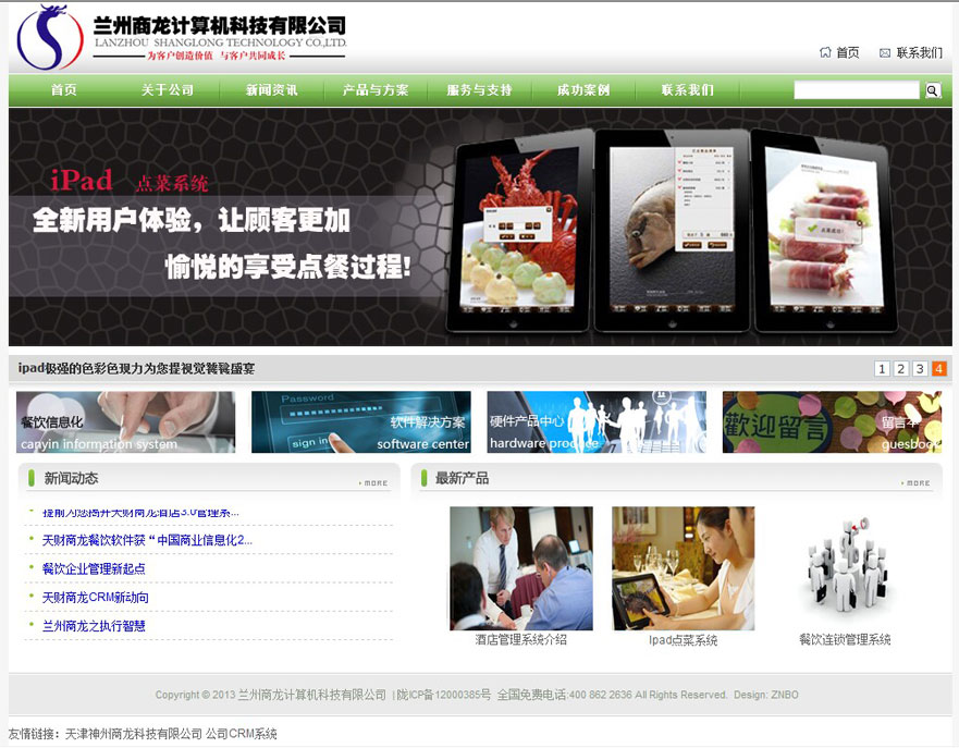 兰州商龙计算机科技有限那公司成立于2006年5月,公司主要涉及酒店餐饮娱乐及医药行业的管理软件、监控系统及弱电综合布线工程。经过六年多的发展,兰州商龙成为甘肃地区最专业餐饮娱乐行业信息化整体解决方案供应商,已为200家以上餐饮酒店企业提供了专业的信息化服务(管理软件,点菜设备,远程监控,连锁管理平台,会员CRM管理系统),产品在兰州地区的中高端酒店餐饮市场占有率达70%以上,目前公司成为国内最专业的酒店餐饮信息化供应商天津神州商龙计算机科技有限公司甘肃地区的AAAA级合作伙伴,成为广州金博软件信息有限公司在兰州地区的核心代理商,先后为鑫海大酒店,开盛海港集团、皇家国宴、狗不理、银峰、金泰餐饮、火吧餐饮、临夏济民药业集团等知名企业提供信息化产品及服务,得到客户广泛认可,我们致力于通过我们优秀的产品,专业的实施队伍,稳定的售后服务为甘肃地区民营企业的飞速发展保驾护航!