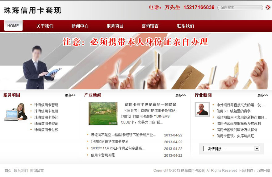 项目名称:珠海信用卡套现服务公司网站建设签定日期:2013年4月19日网址:http://www.guoyonghy.com珠海信用卡套现服务公司是一家专业的信用卡周边服务的公司,服务有:珠海信用卡套现,珠海信用卡垫还,信用卡养卡,信用卡代