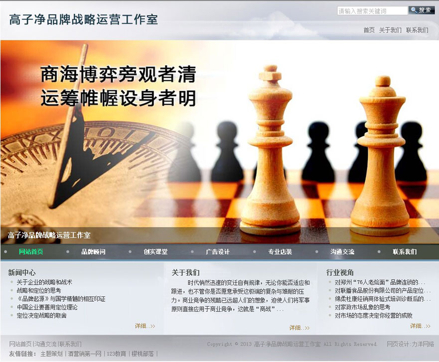 项目名称:高子净品牌战略运营工作室网站建设签定日期:2013年4月23日网址:http://www.gaozijing.com品牌是当今时代背景下,企业发展战略的指南针,而不是战略棋子;品牌是聚焦的奇点;品牌的定位关系到全方位的管理布局和资