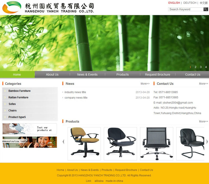 Hangzhou Yanch Trading Co., Ltd is located in Hangzhou city, Zhejiang province. Our company is specialized in supplying bamboo furniture, ratten furniture, sofas, office chairs and other decoration materials. Our products can be used in houses, offices, restaurants, hotels, bars, gardens and beaches.