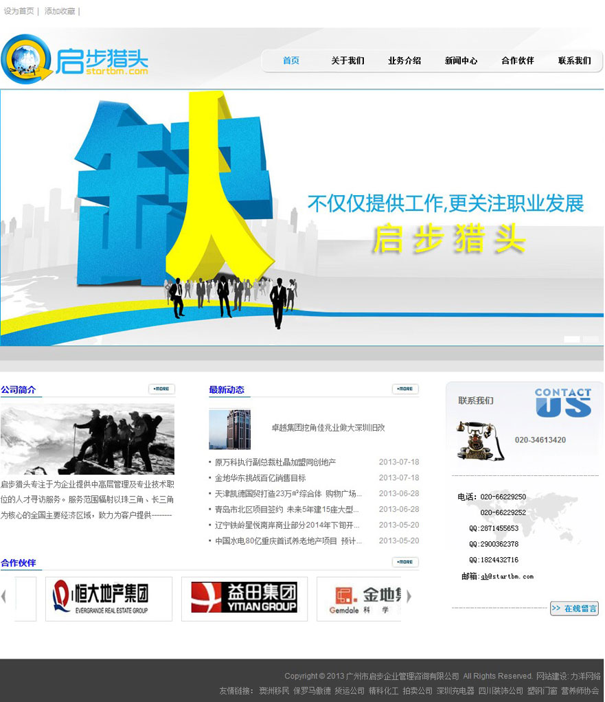 项目名称:广州市启步企业管理咨询有限公司网站建设签定日期:2013年5月4日网址:http://www.startbm.com启步猎头专注于为企业提供中高层管理及专业技术职位的人才寻访服务。服务范围辐射以珠三角、长三角为核心的全国主要经济区