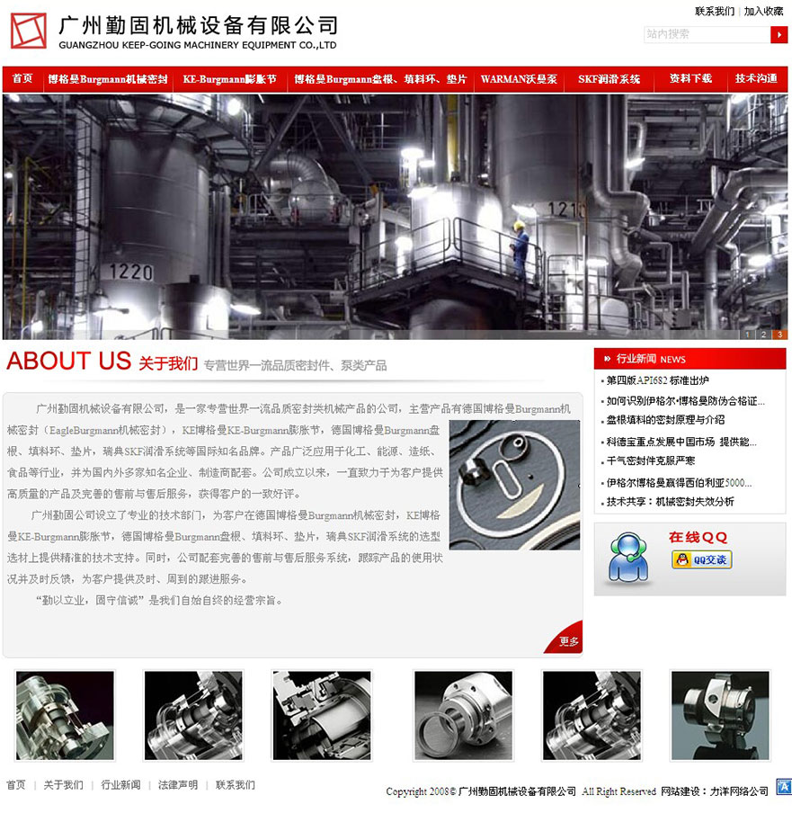 项目名称:广州勤固机械设备有限公司网站建设签定日期:2013年5月27日网址:http://www.gz-keepgoing.com广州勤固机械设备有限公司,是一家专营世界一流品质密封类机械产品的公司,主营产品有德国博格曼Burgmann机