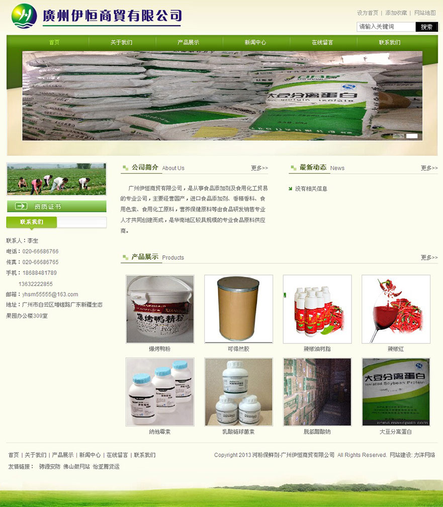 项目名称:广州伊恒商贸有限公司网站建设签定日期:2013年6月3日网址:http://www.yhsm555.com广州伊恒商贸有限公司,是从事食品添加剂及食用化工贸易的专业公司,主要经营国产,进口食品添加剂、香精香料、食用色素、食用化工原