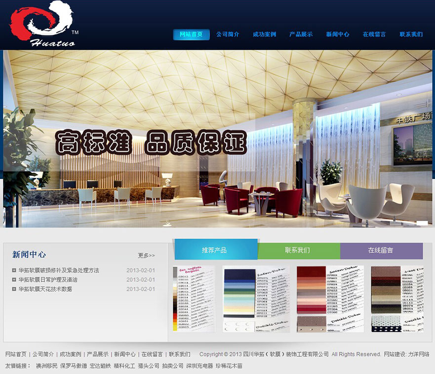 项目名称:四川华拓装饰工程网站建设签定日期:2013年6月6日网址:http://www.h-tuo.com四川华拓(软膜)装饰工程有限公司,成立于2012年,至今公司致力于华拓软膜天花产品的研发、销售及安装服务。公司的主要产品包括透光膜、