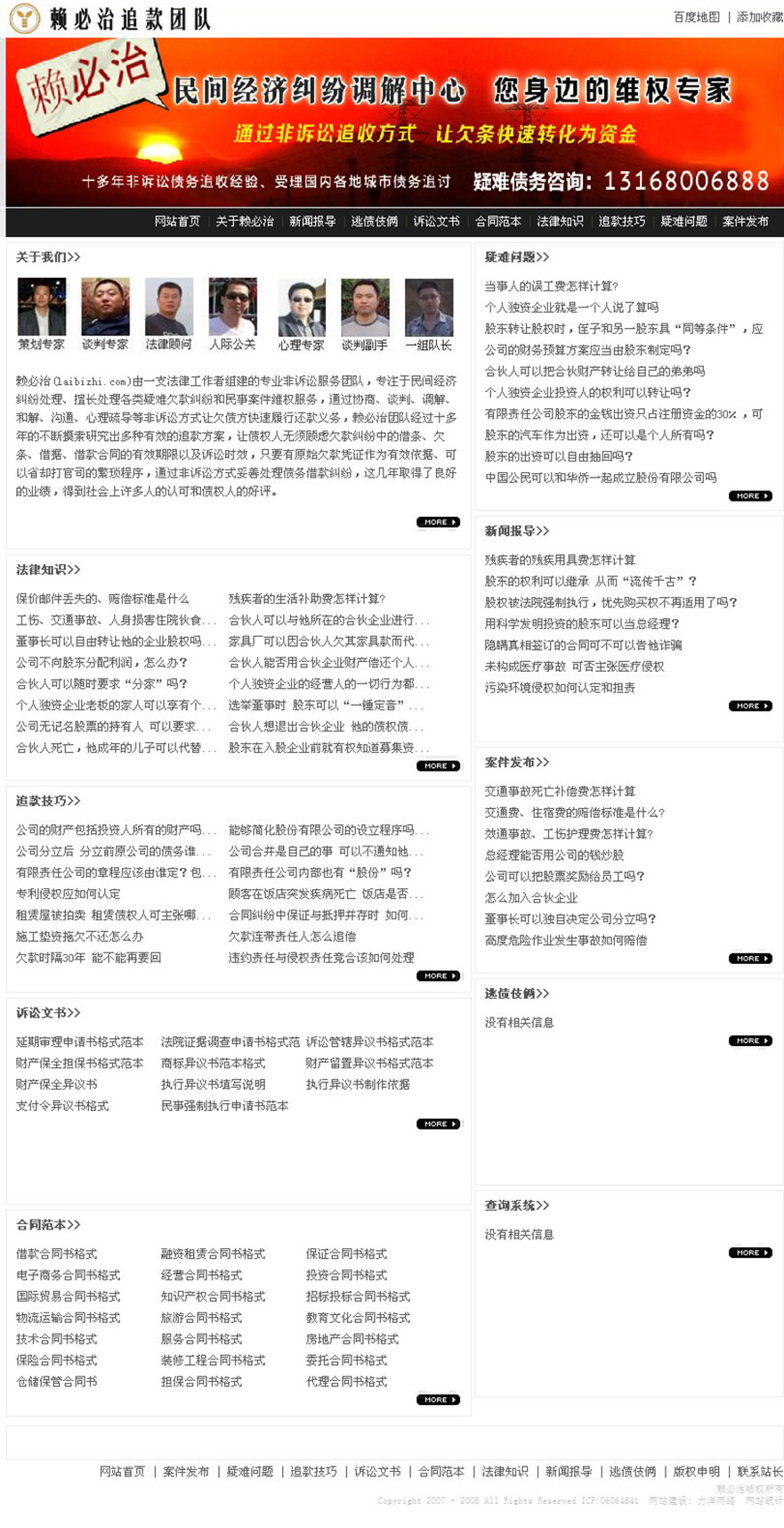 项目名称:赖必治网站建设签定日期:2013年6月10日网址:http://www.laibizhi.com恶意欠款,欠债不还已经成为现今制约和干扰社会集体的经济正常运行的一个严重问题,也是各大企业,私营老板最为头痛的大事,面对欠债人的恶意拖
