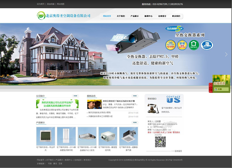 项目名称:北京奥得圣空调设备有限公司 签定时间:2013-10-10 项目网址:http://www.adskt.com/ 项目简介: 北京奥得圣空调设备有限公司致力于提供高效节能、舒适环保新风系统系列产品及中央空调系统系列