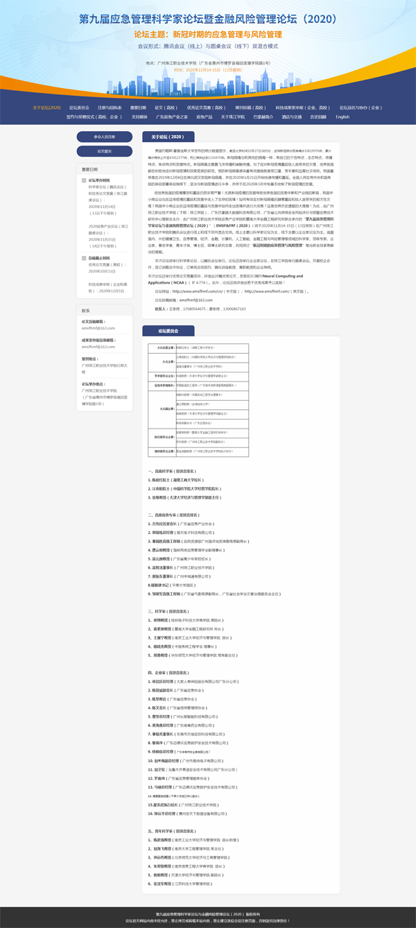 但世界各国的疫情爆发和蔓延仍然非常严重!尤其新冠疫情的发展导致世界各国的贸易中断和产业链的断裂,我国中小微企业也在这场疫情的蔓延和发展中走入了生存的困境!如何有效应对新冠病毒的肆意蔓延和给人类带来的毁灭性灾难?我国中小微企业在这场疫情的蔓延与发展中如何走出困境并进行大突围?这是世界历史遗留的大难题!为此,由广州珠江职业技术学院(下称:珠江学院)、广东巴拿赫大数据科技有限公司、广东省公共网络安全风险评价与预警应急技术研究中心等联合主办,由广州珠江职业技术学院应急产业学院和暨南大学金融工程研究所联合承办的“第九届应急管理科学家论坛与金融风险管理论坛(2020)”(EMSF&FRF(2020))将于2020年11月14-15日(13日报到)在广州珠江职业技术学院和腾讯会议进行线上和线下双向混合交流。线上主要以科学家论坛为主,线下主要以企业家论坛为主。诚邀海内、外的健康卫生、应急管理、经济、金融、计算机、人工智能、金融工程与风险管理等领域的科学家、顶级专家、企业家、著名学者、青年才俊、博士后、硕博士研究生等,共同探讨“新冠时期的应急管理与风险管理”等当前全球紧急解决的难题。